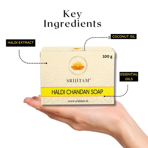 Inspired by the ancient rituals of beauty, Srijitam Haldi Chandan Soap unites the golden radiance of Haldi (Turmeric)with the cooling purity of Sandalwood (Chandan). This luxurious handmade bar gently cleanses and soothes, leaving the skin refreshed, even-toned, and naturally radiant. Its earthy aroma calms the senses and restores balance to both body and mind.